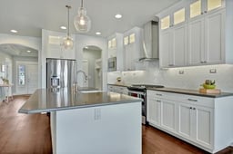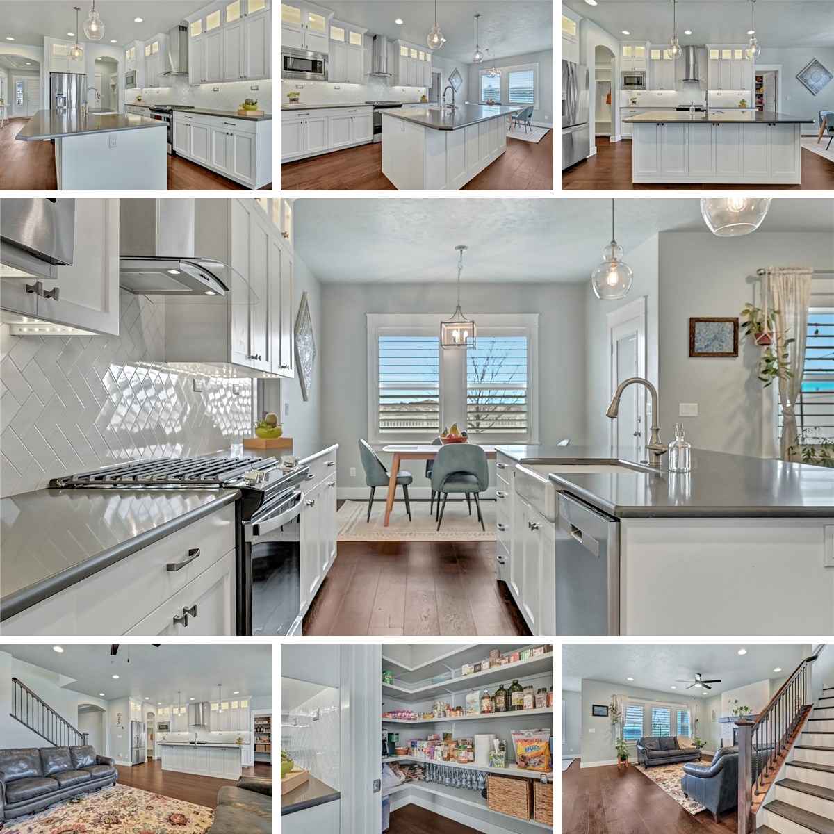 The kitchen stands as a refined centerpiece. Quartz countertops, a designer tile backsplash, and stainless steel appliances are complemented by a statement vent hood and a newly installed gas range, oven, and dishwasher. A generous island with abundant storage and counter seating invites gathering, while the undermount single-bowl farmhouse sink and custom full-height cabinetry elevate both function and form. Ambient upper and under-cabinet lighting, pendant fixtures, and recessed lights create a layered glow that feels both intimate and refined. Just beyond, a spacious walk-in baker’s pantry offers exceptional storage for the avid entertainer.